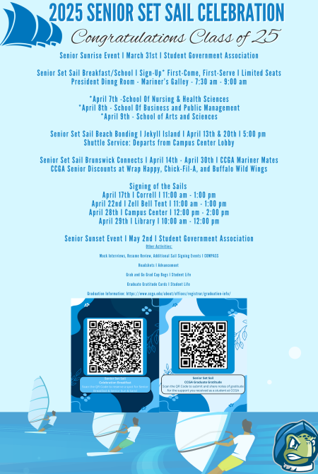 While the College of Coastal Georgia hosted graduation on May 9, the Student Life Office started the celebration by hosting its Senior Set Sail Celebration Spring 2025. In addition to partnering with campus departments (COMPASS/Advising, Registrar, Dining Services, and Student Government), Student Life facilitated senior breakfasts/brunches by school, beach bonding Sundays, additional Mariner Mate discounts from community connections, and grad cap bags/portfolios. Congratulations to Spring 2025 Coastal Georgia Graduates! Keep making Coastal proud!
