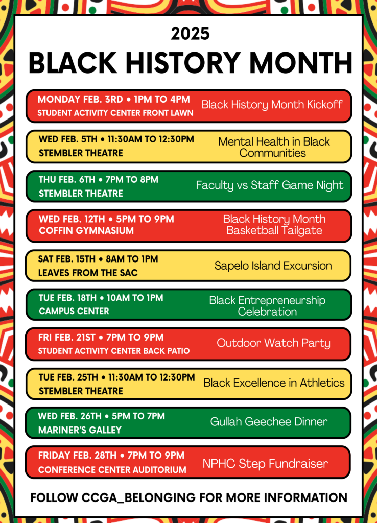 Join the College of Coastal Georgia this February to celebrate the history, resilience, and vibrant culture of the African American community. For more information, visit www.ccga.edu/black-history-month or contact the Office of Campus Community and Belonging at belonging@ccga.edu.