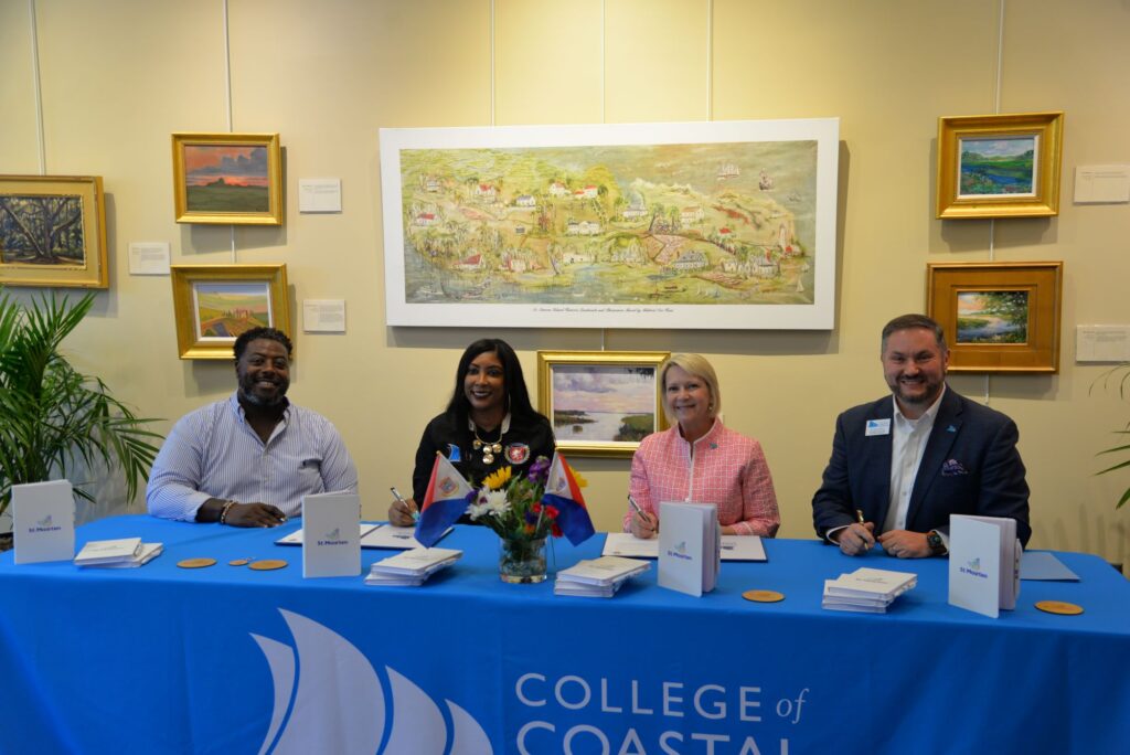 In a historic moment, the College of Coastal Georgia and Learning Unlimited Preparatory School of St. Maarten signed a memorandum of understanding that will allow students at Learning Unlimited to participate in joint enrollment at the College. Students from Learning Unlimited will soon take online courses, such as introduction to business, abnormal psychology, medical terminology, and biology.