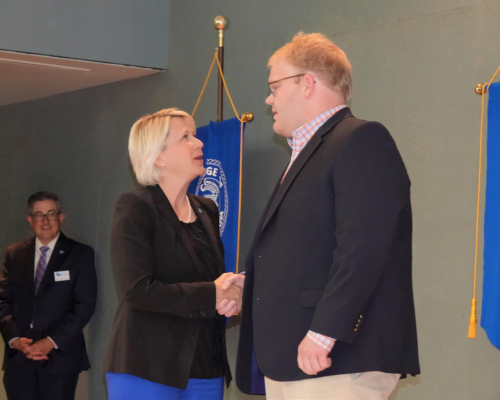 College of Coastal Georgia President Michelle Johnston (right) congratulates Beau Teston (left) at the College’s annual Honors Day ceremony for being recognized by the University System of Georgia as a 2023 Academic Recognition Day Honoree.