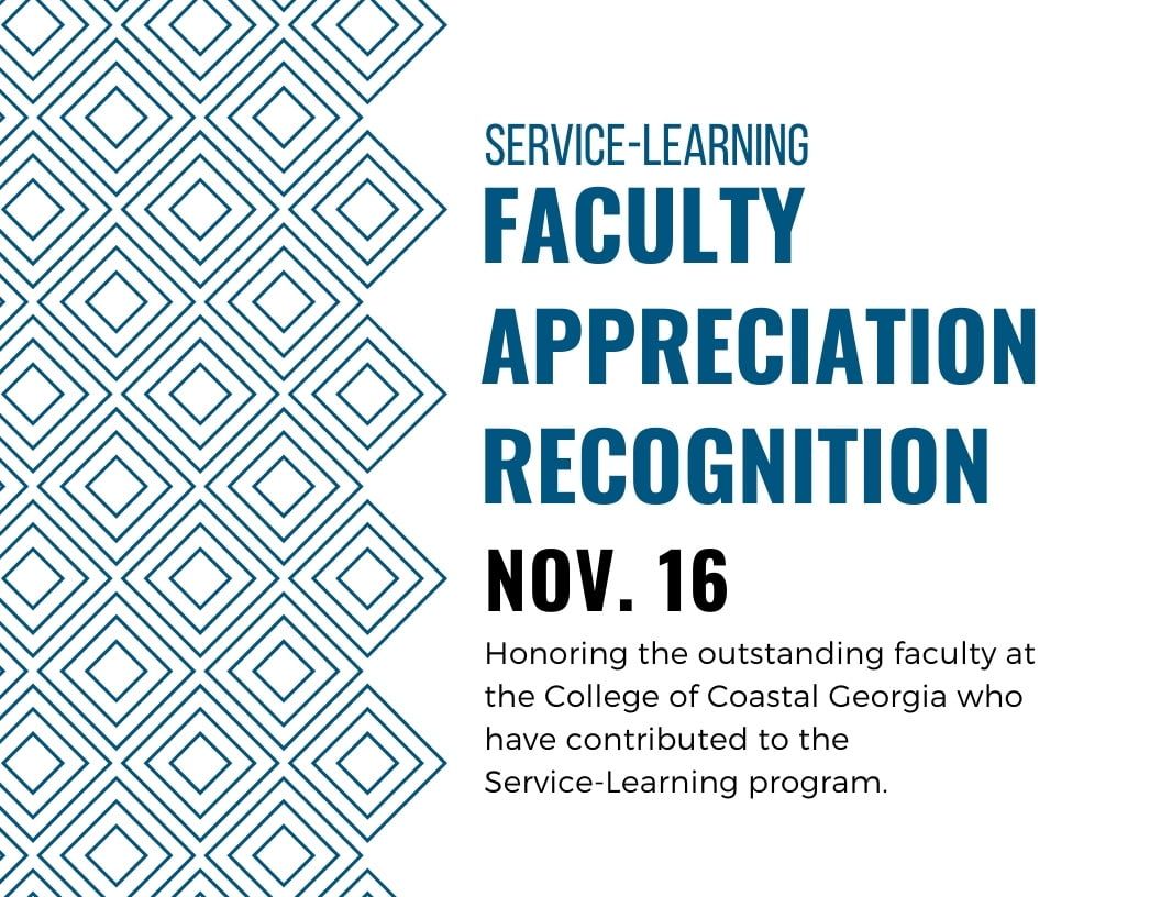 The College of Coastal Georgia’s Center for Service-Learning is hosting an online Service-Learning Faculty Appreciation Recognition event starting November 16 to honor faculty members who have contributed to the service-learning program in 2020.