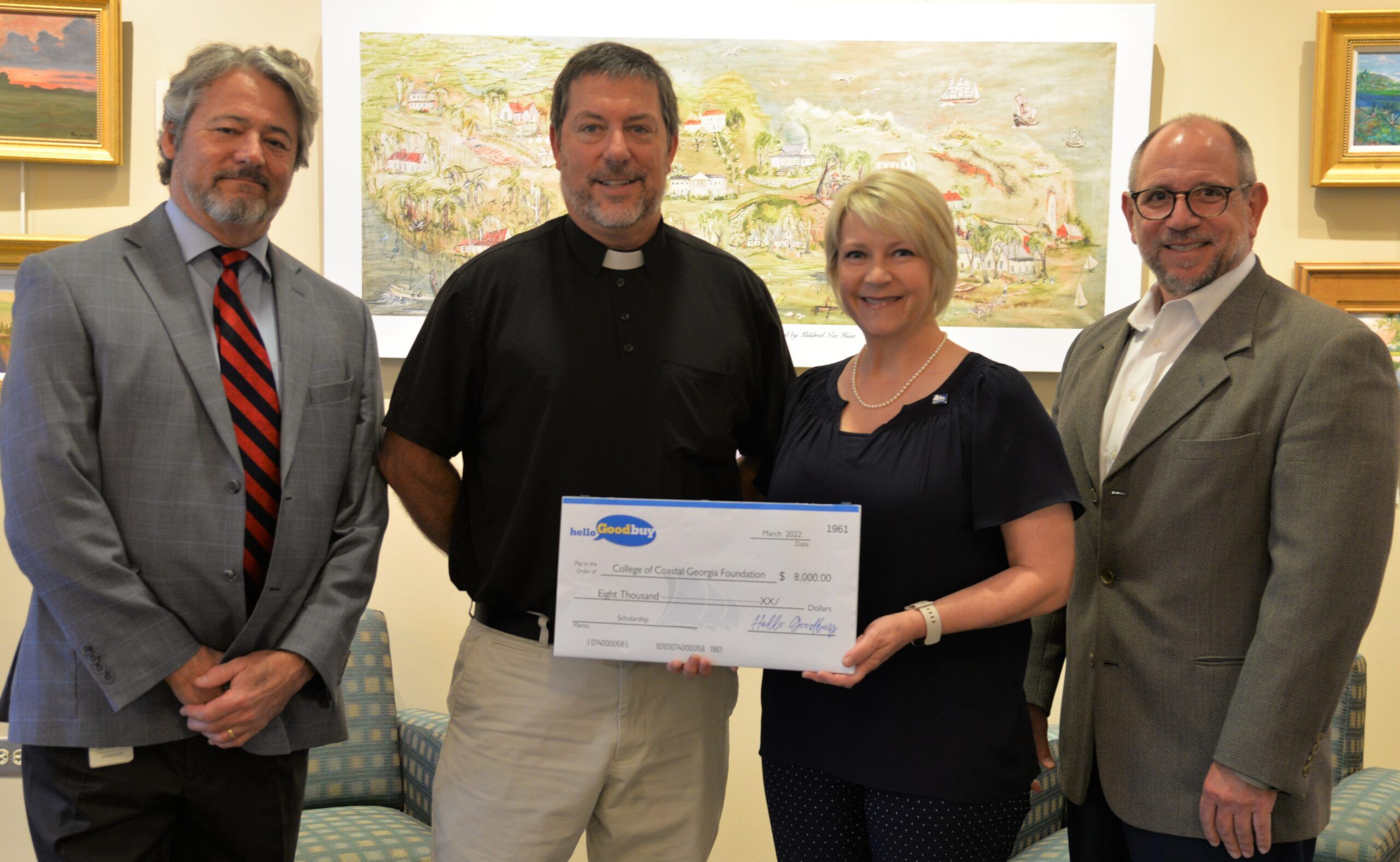 hello Goodbuy, a thrift store and outreach ministry of St. Mark’s Episcopal Church, has created the Hello Goodbuy Scholarship at the College of Coastal Georgia, continuing its efforts to give back and empower the community. Alan Younger, chairman of the board of advisors of hello Goodbuy, and Rev. Alan Akridge, rector of St. Mark’s, presented President Michelle R. Johnston and Vice President of Advancement Jamie Bessette with a check to fund the scholarship. The scholarship will benefit full-time students in good academic standing at the College, who have graduated from a Glynn County high school, and demonstrated a financial need. hello Goodbuy strongly believes in supporting the area and has given back over $1 million to better the community.