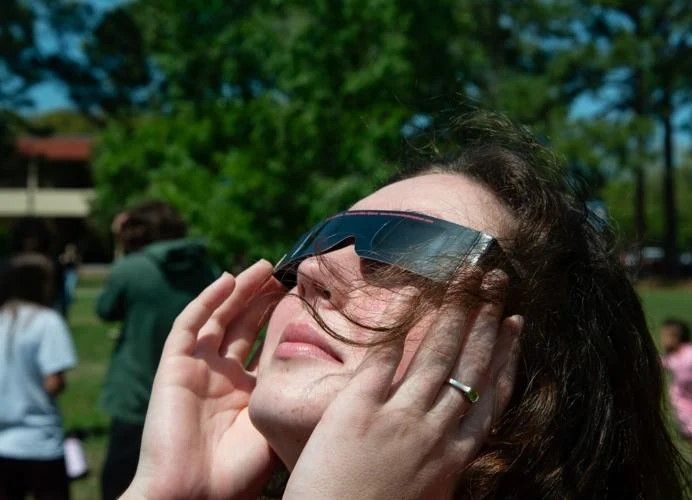 Dozens of students at College of Coastal Georgia gathered around a tent on the grounds to watch Monday’s eclipse through a couple of tracking telescopes and on a big screen TV that showed the image from a digital telescope.