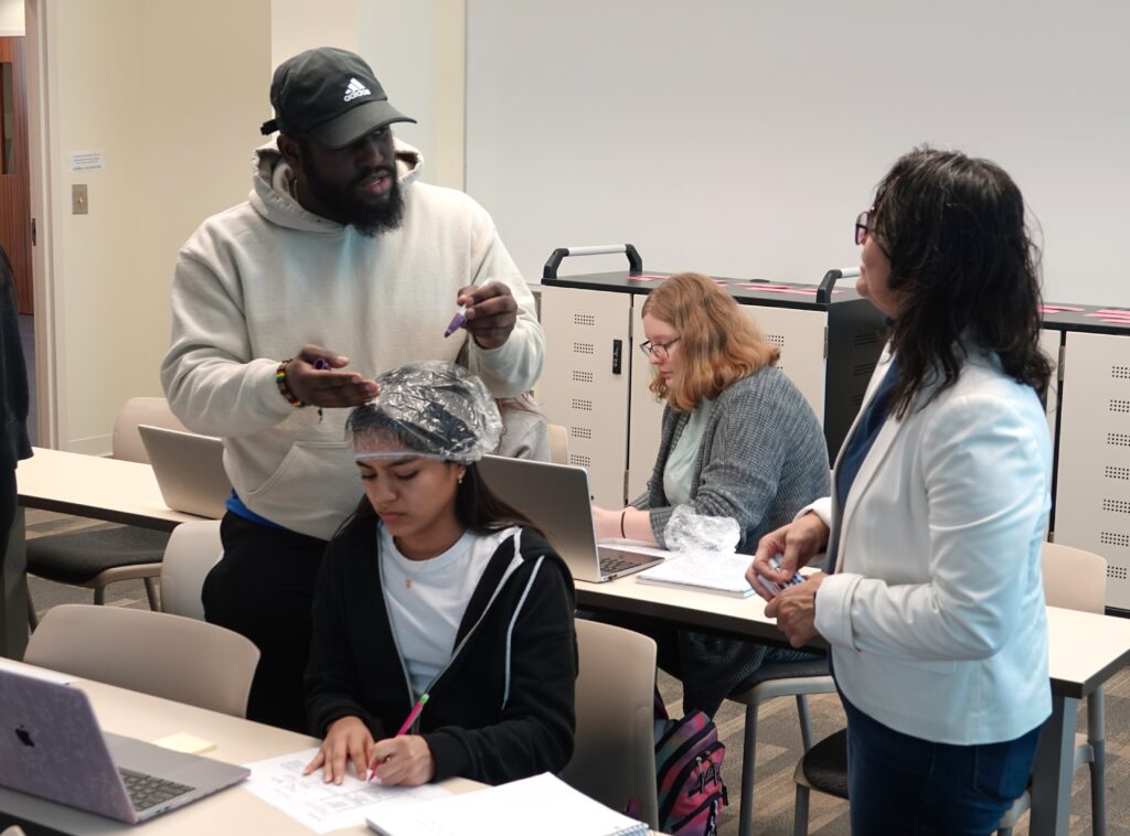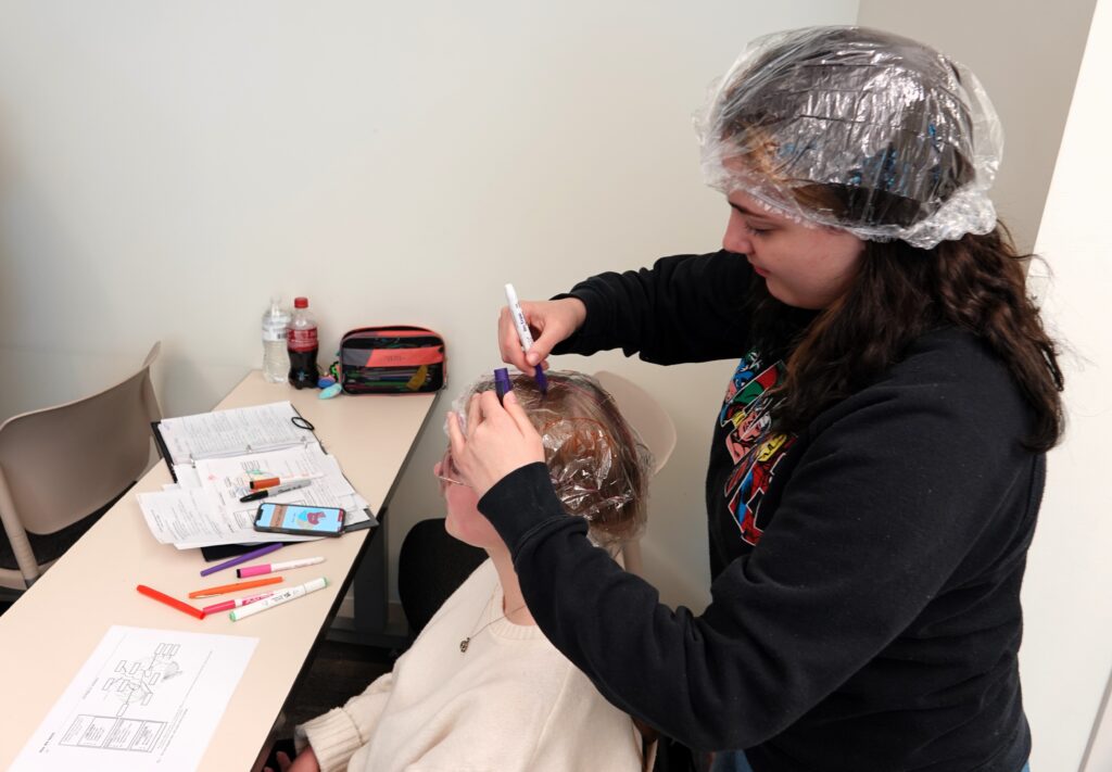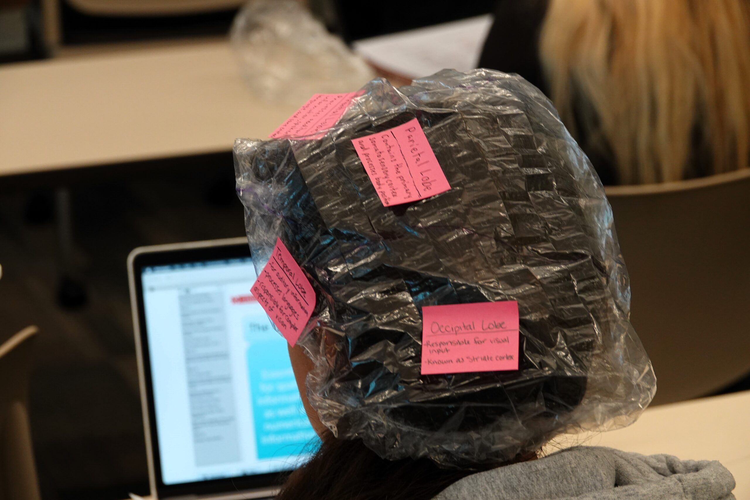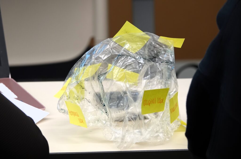 After giving a lecture on the different areas of the brain, students worked in pairs and used shower caps to map the four lobes of the brain. One student wore the shower cap, while the other drew the four lobes of the brain on the shower cap in their corresponding locations. They then used sticky notes to label each lobe and its main functions.